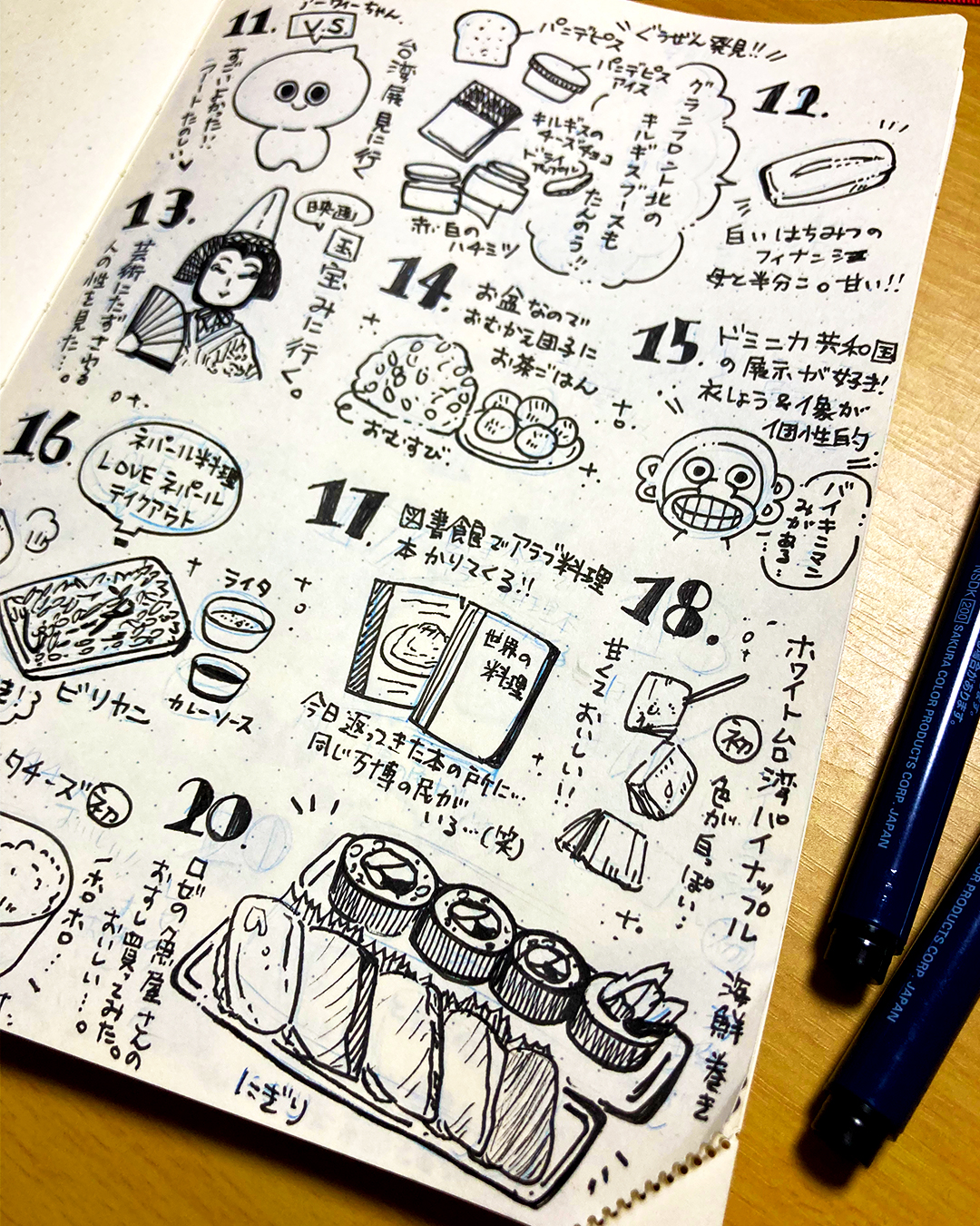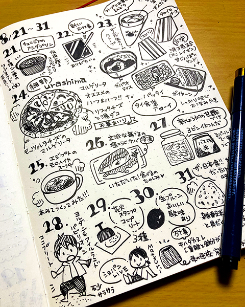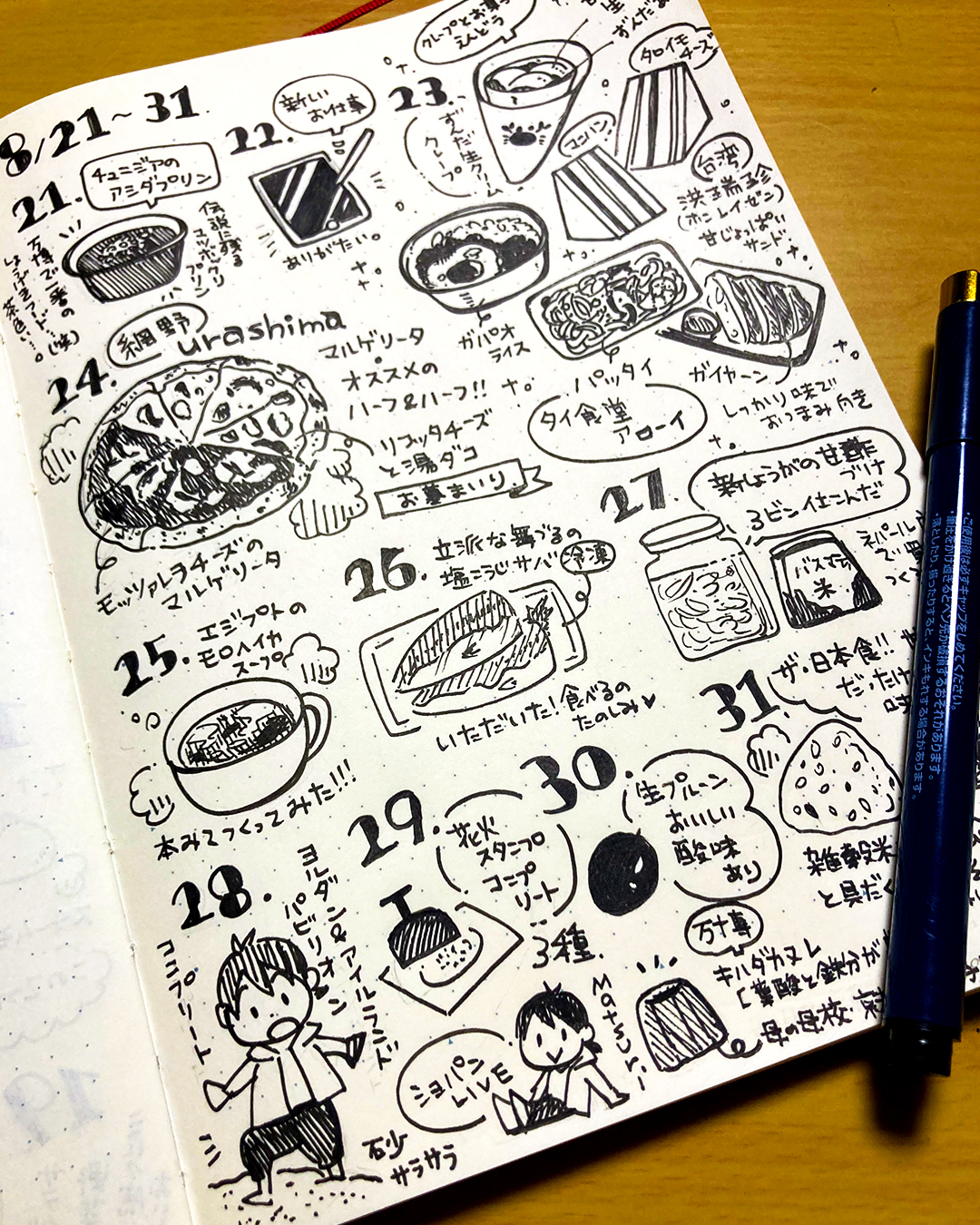 後でまとめて良かったこと絵日記として、ペンでサクっとその日に一番印象に残ったことや楽しかったこと、嬉しかったことを簡単に描いていっています。